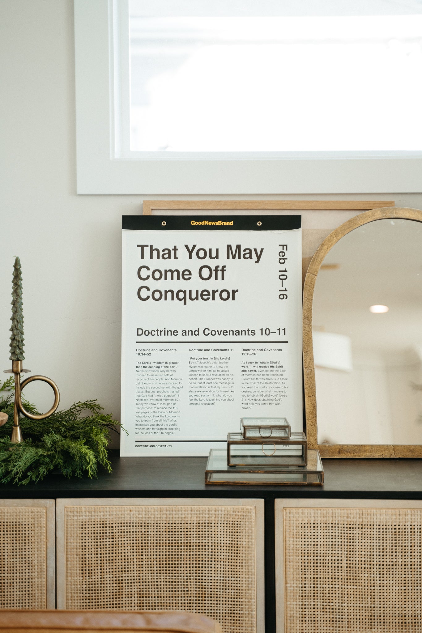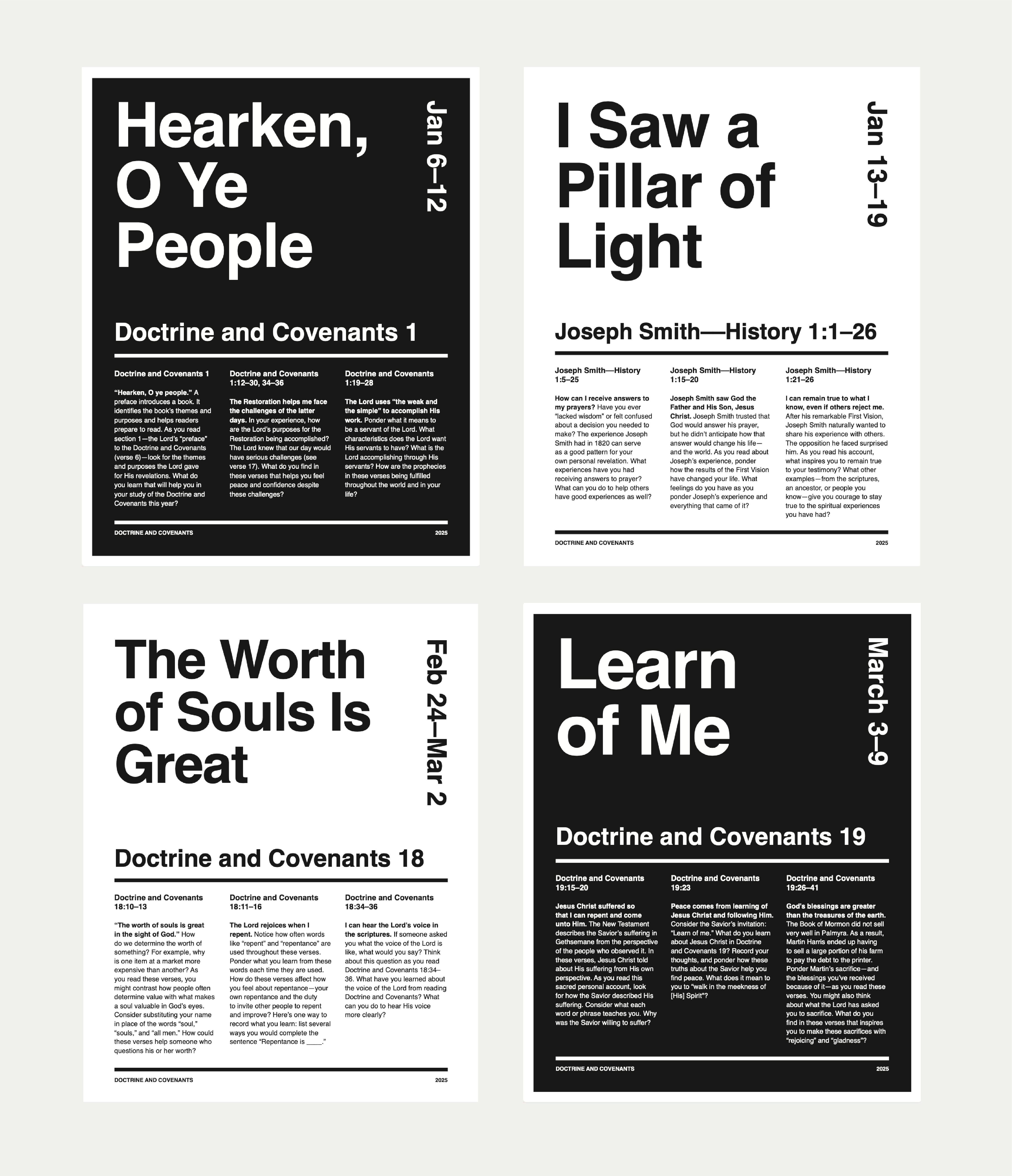 Keep Come, Follow Me top of mind with these weekly lessons on the Doctrine and Covenants for 2025. All 52 lessons are included in a single poster pad with perforation for easy transition from one week to the next! Each poster includes: (1) the lesson title and reading, in line with the Come, Follow Me curriculum, (2) three selected doctrines and the associated scriptures, and (3) prompts and questions for pondering and family discussion.