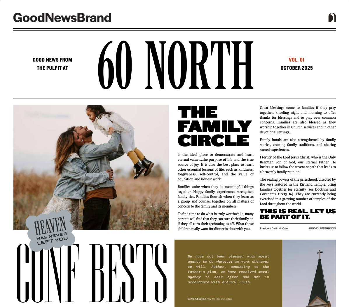 A broadsheet newspaper filled with our favorite quotes from Conference! Free with any purchase, excluding digital items and wall hangings. Simply add another item to your cart and 60 North will be added automatically.