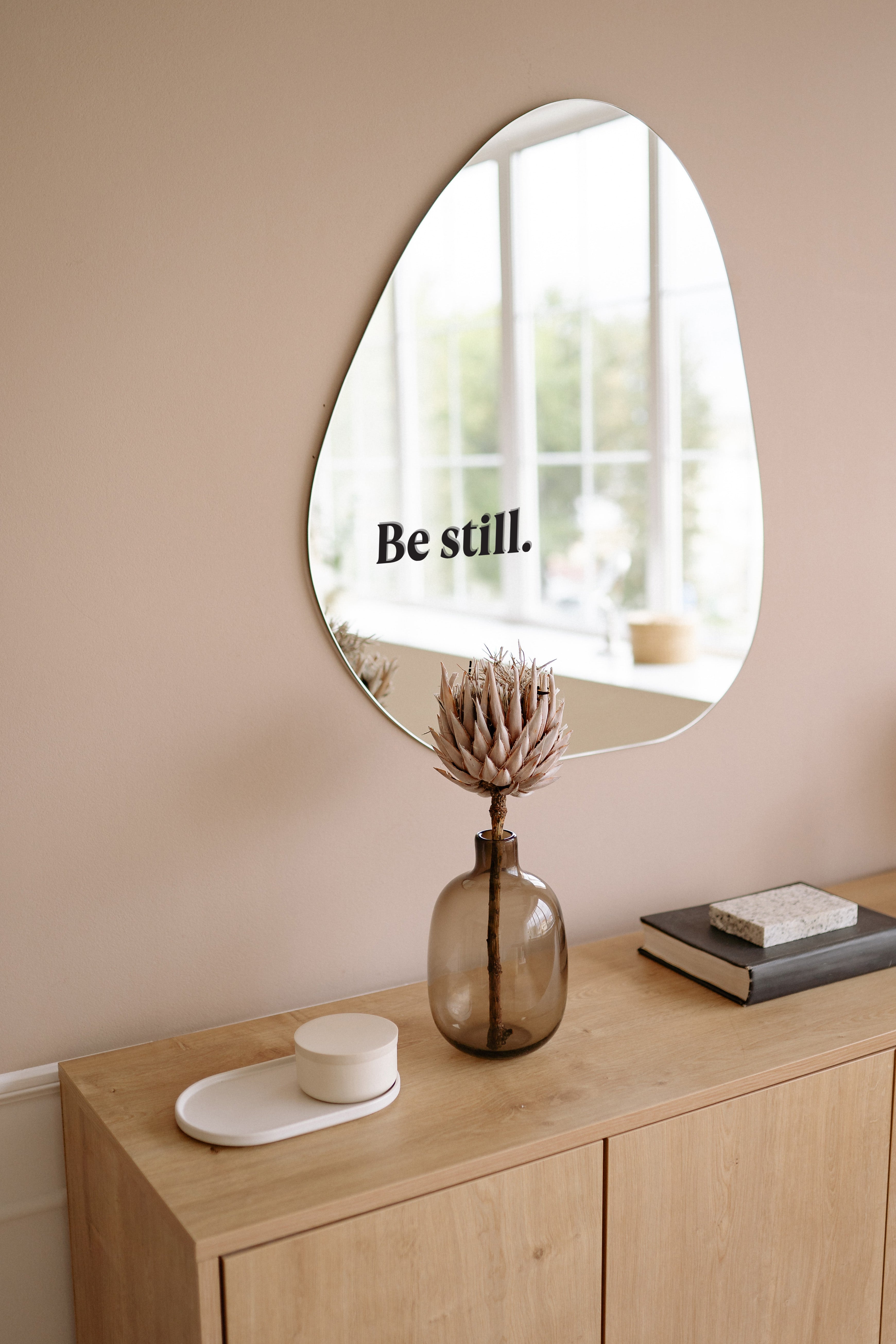 A minimal decal to remind you to be still. This high-quality vinyl transfer sticker is designed for your mirror, computer, windows, or wherever you'll see it most.
