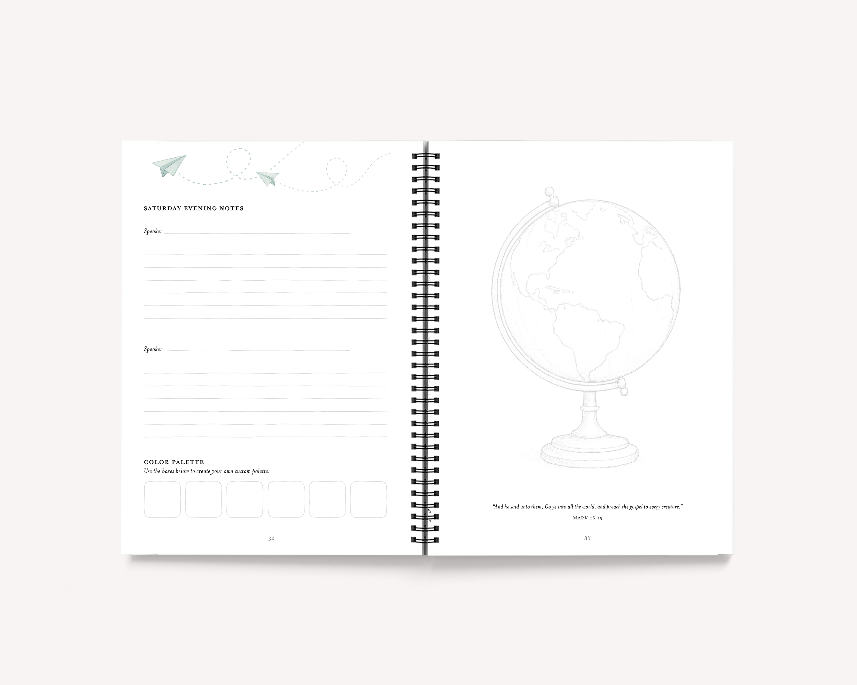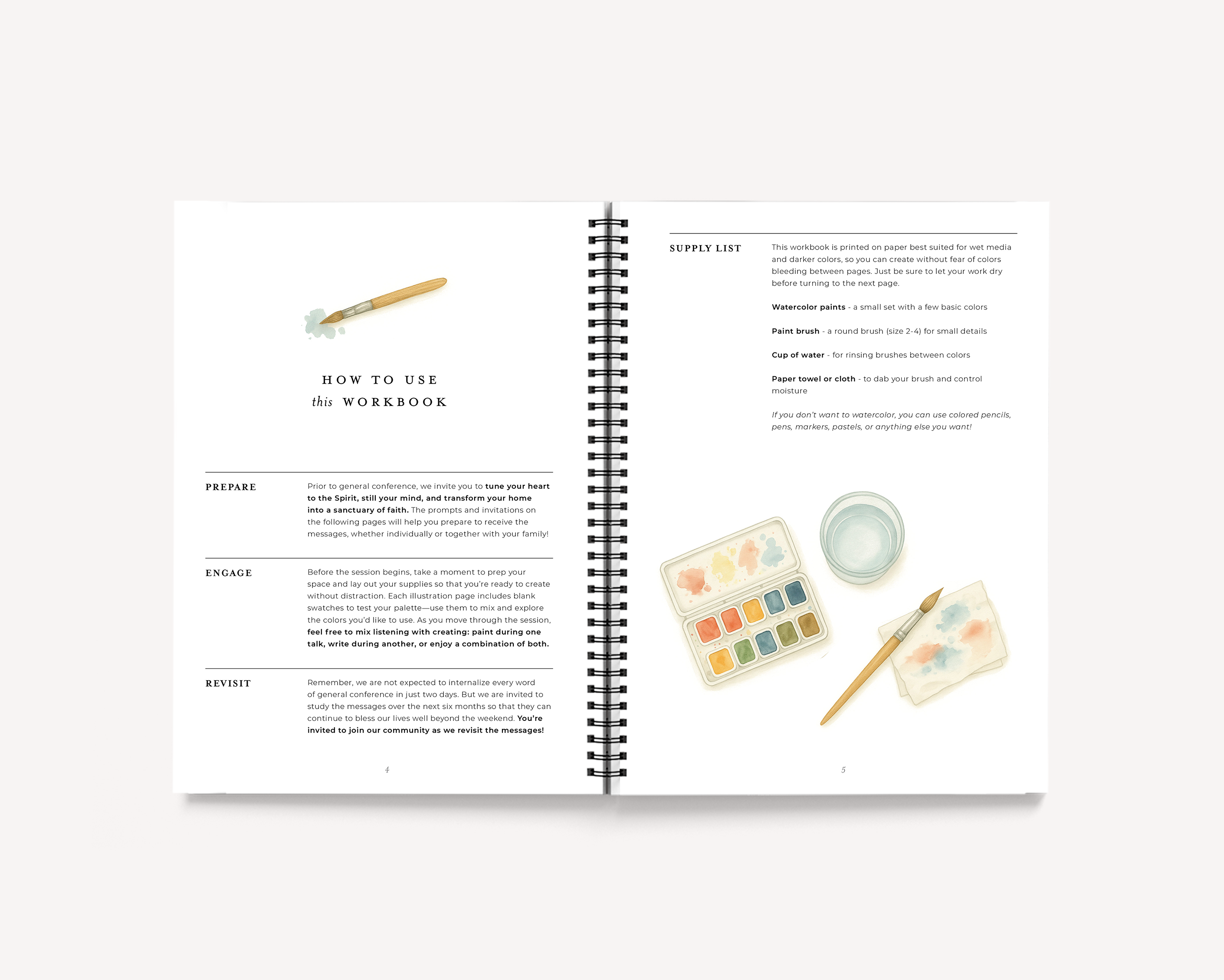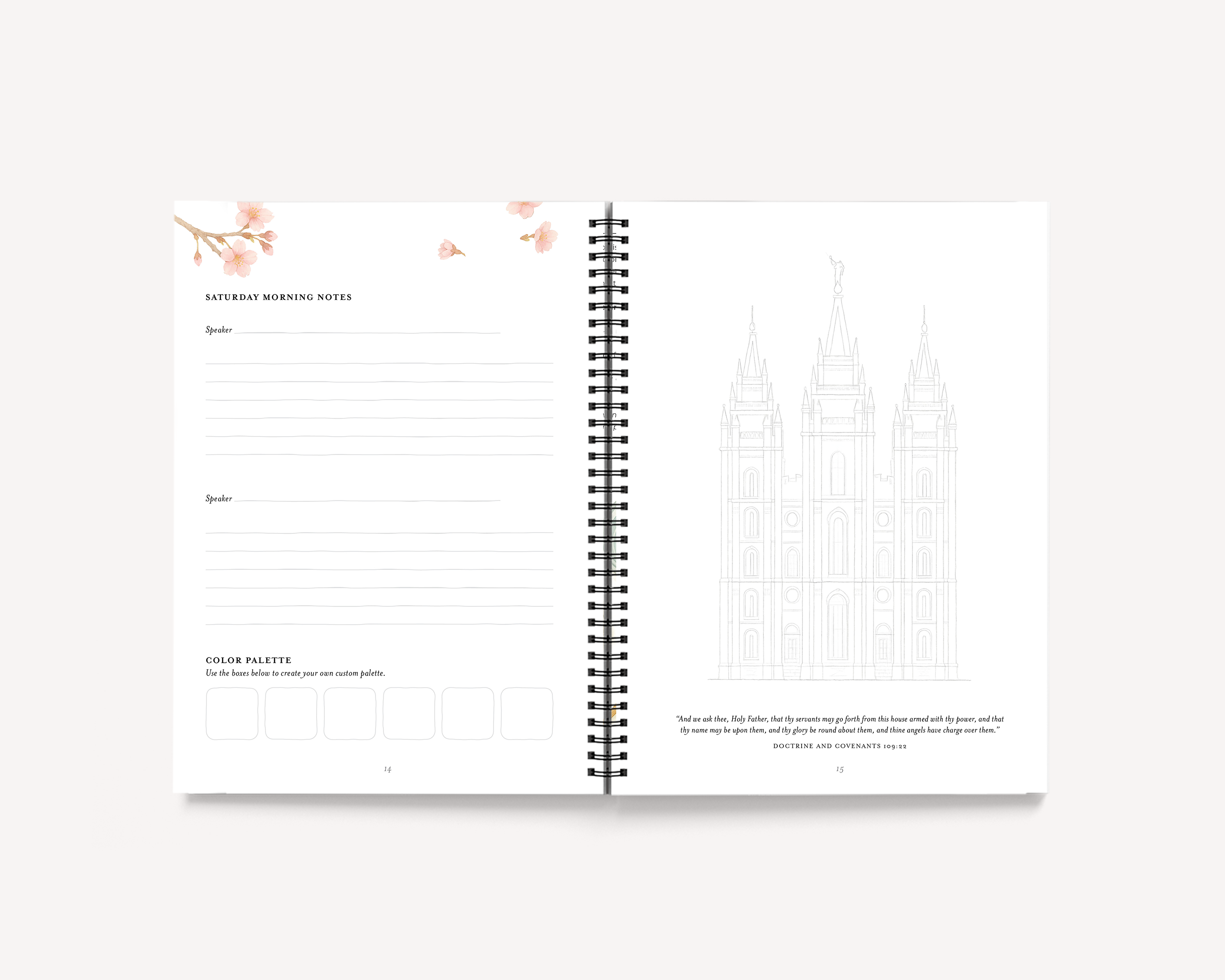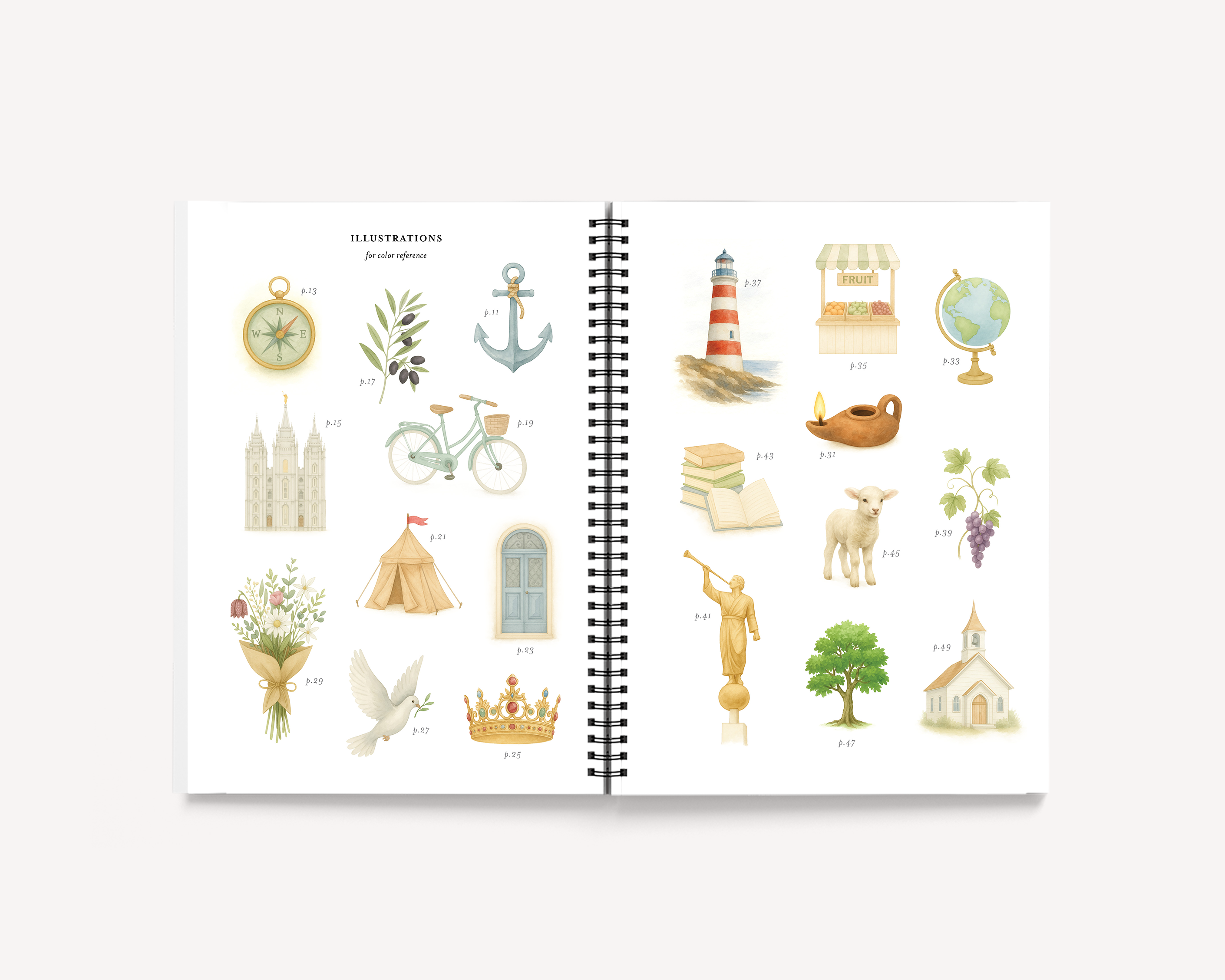 Bring General Conference to life with this one-of-a-kind watercolor workbook—a peaceful, creative companion designed to help you listen, reflect, and create. Each spread features gospel-themed illustrations, ready to be painted on thick art paper, with room on the opposite page for notes from two talks.
