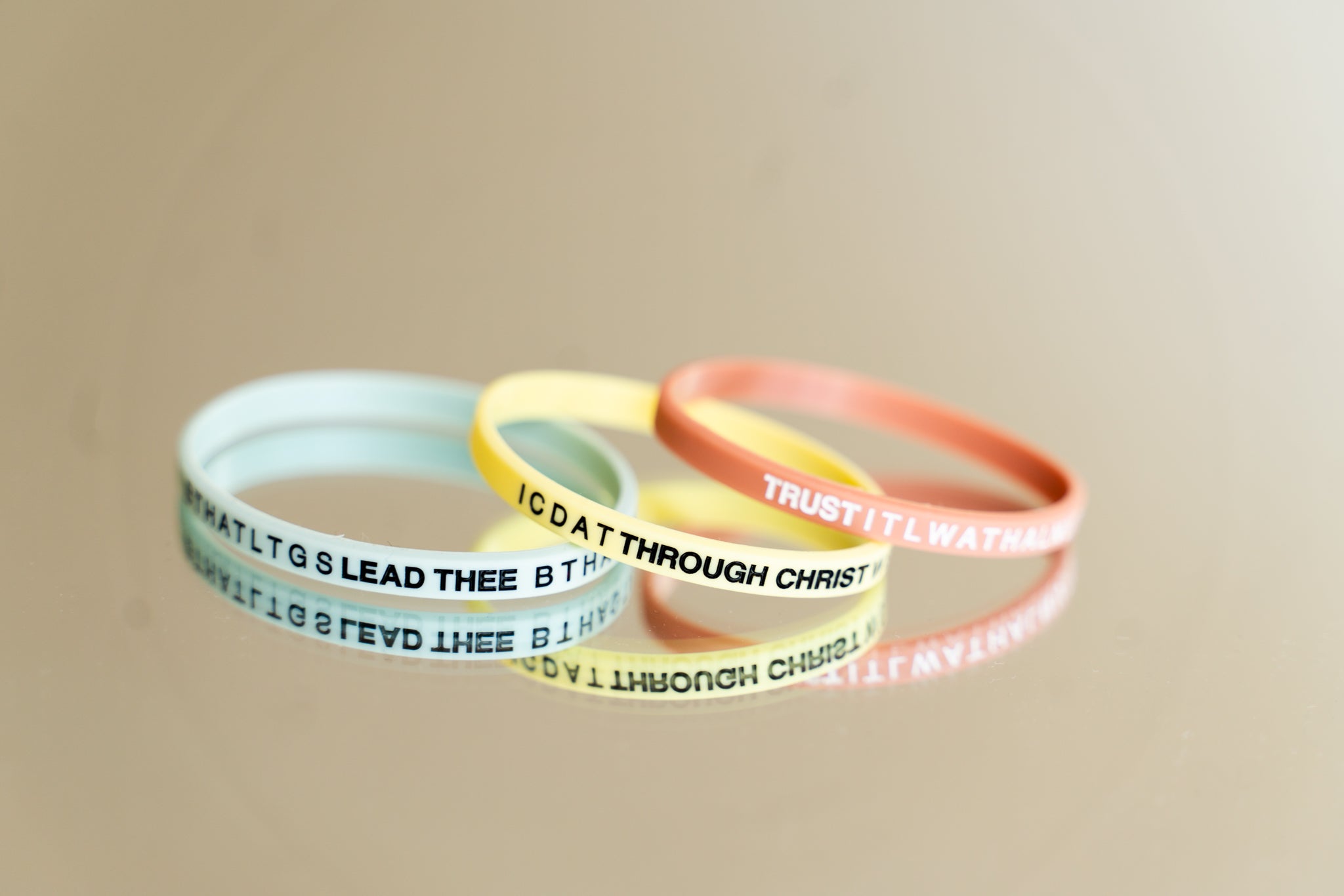 The letters on the silicone bracelets are the first letters of each word of the verse they come from. It can be both a reminder of what it teaches and a way to memorize them—locking the words up in your heart.