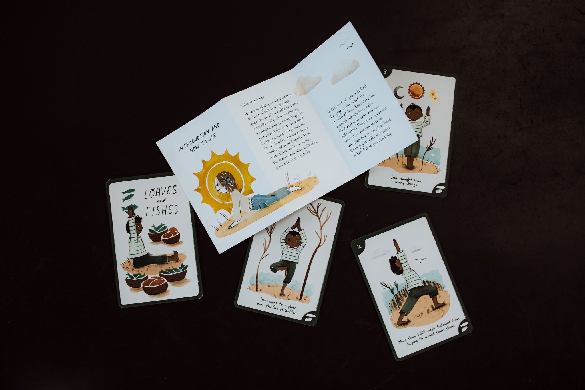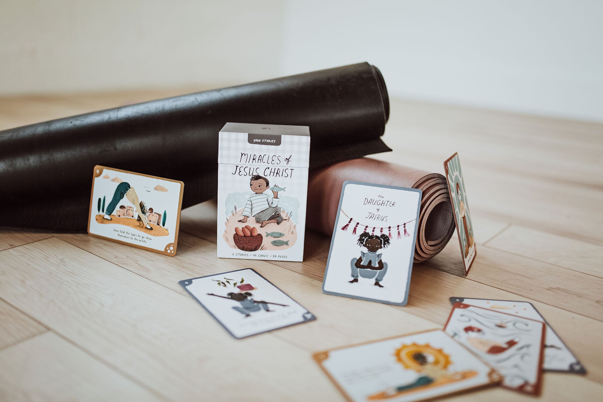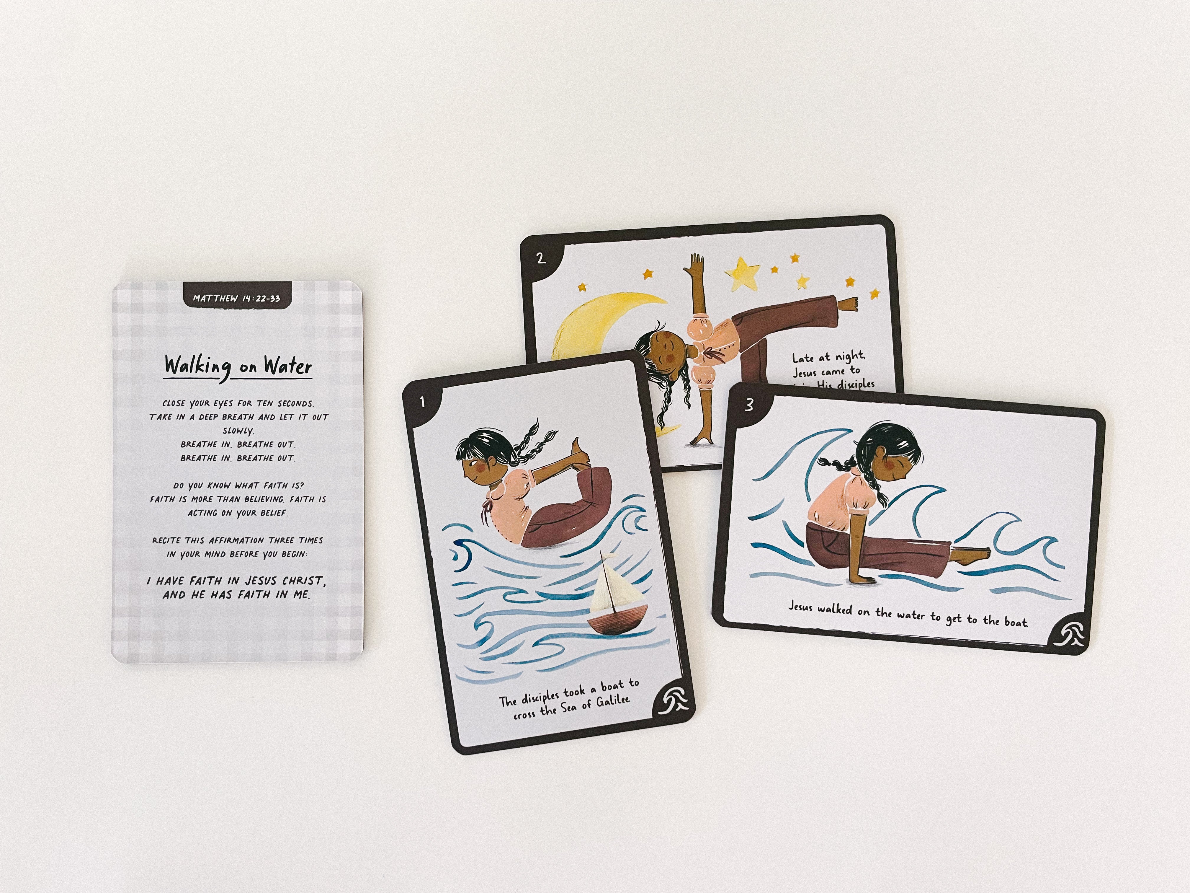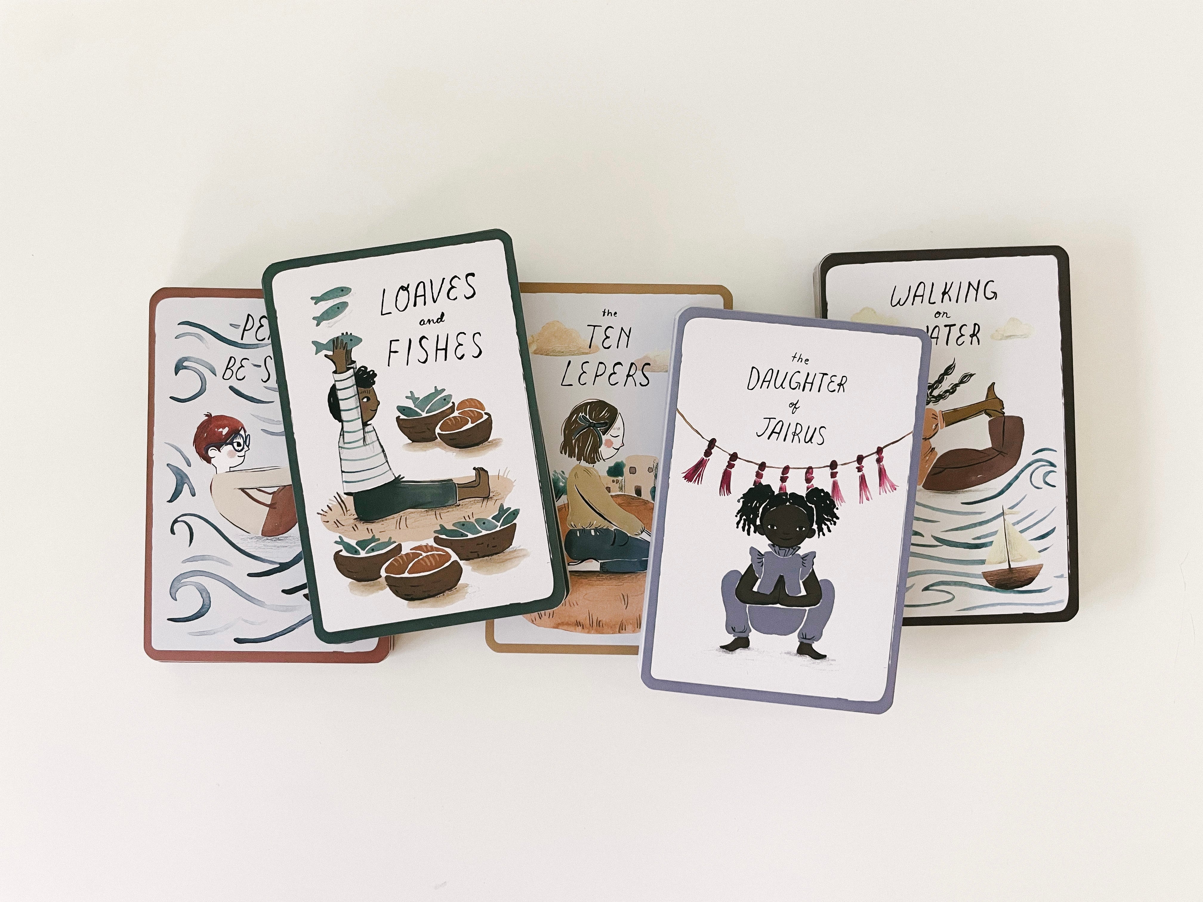 Explore the miracles of Jesus Christ through movement and play! This card set, designed for kids of all ages, explores 5 of Jesus's miracles from the New Testament with an introductory affirmation and 8 poses for each yoga flow.