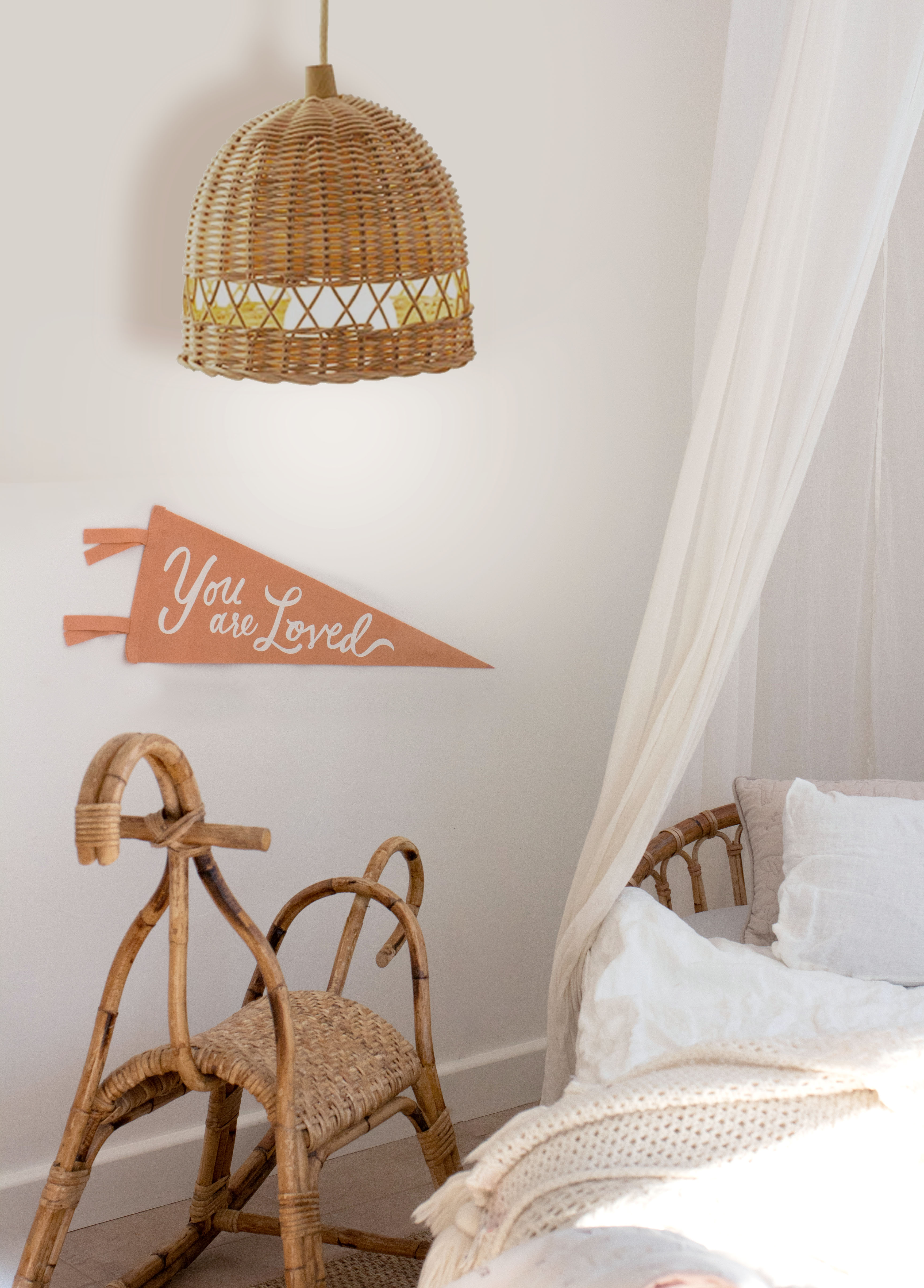 Add a touch of classic charm and a beautiful reminder of this timeless truth to any space. Crafted from a premium quality wool felt blend, these pennants feature playful colors, perfect for nurseries, playrooms, or bedrooms. Pennants are lightweight, and easy to hang.